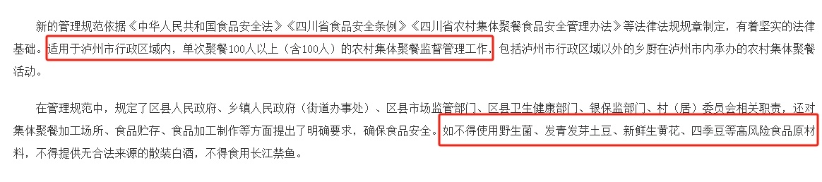 根据四川泸州发布的新版《泸州市农村集体聚餐食品安全管理规范》,其适用于泸州市行政区域内,监督管理工作,包括泸州市行政区域以外的乡厨在泸州市内承办的农村集体聚餐活动□。