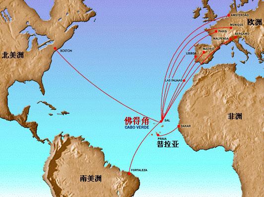 要在地图上的非洲大陆寻找佛得角是找不到的,要沿非洲西海岸到大西洋上去寻找。很多人以为她是非洲南部的好望角,其实她离好望角还有十万八千里。她不在非洲大陆上,而是在离西非国家塞内加尔500公里的海域上。