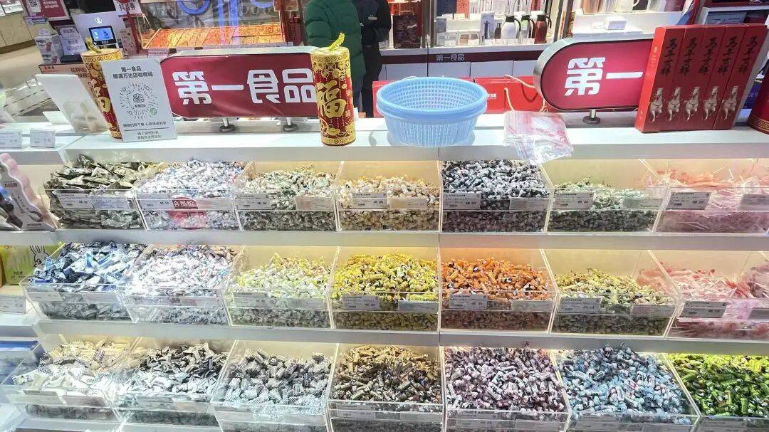 第一食品杨浦店张灯结彩,红灯笼高挂,马年主题喜庆装饰随处可见,烘托出温馨的传统佳节氛围。货架间顾客络绎不绝,收银台前也排起了长队,一派热闹的采购景象。为满足春节市场多元需求,门店早早启动年货备货,精选腊味、糖果、糕点三大核心品类,一站式覆盖市民家庭采购、走亲访友等需求,复刻地道的老上海年节风味。
