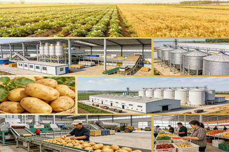 初加工:鲜薯清洗、分级、包装、储藏,配套百万座贮藏窖(库),全国贮藏能力超5000万吨,实现“错峰销售、保值增值”,定西、乌兰察布贮藏能力分别突破350万吨、400万吨;